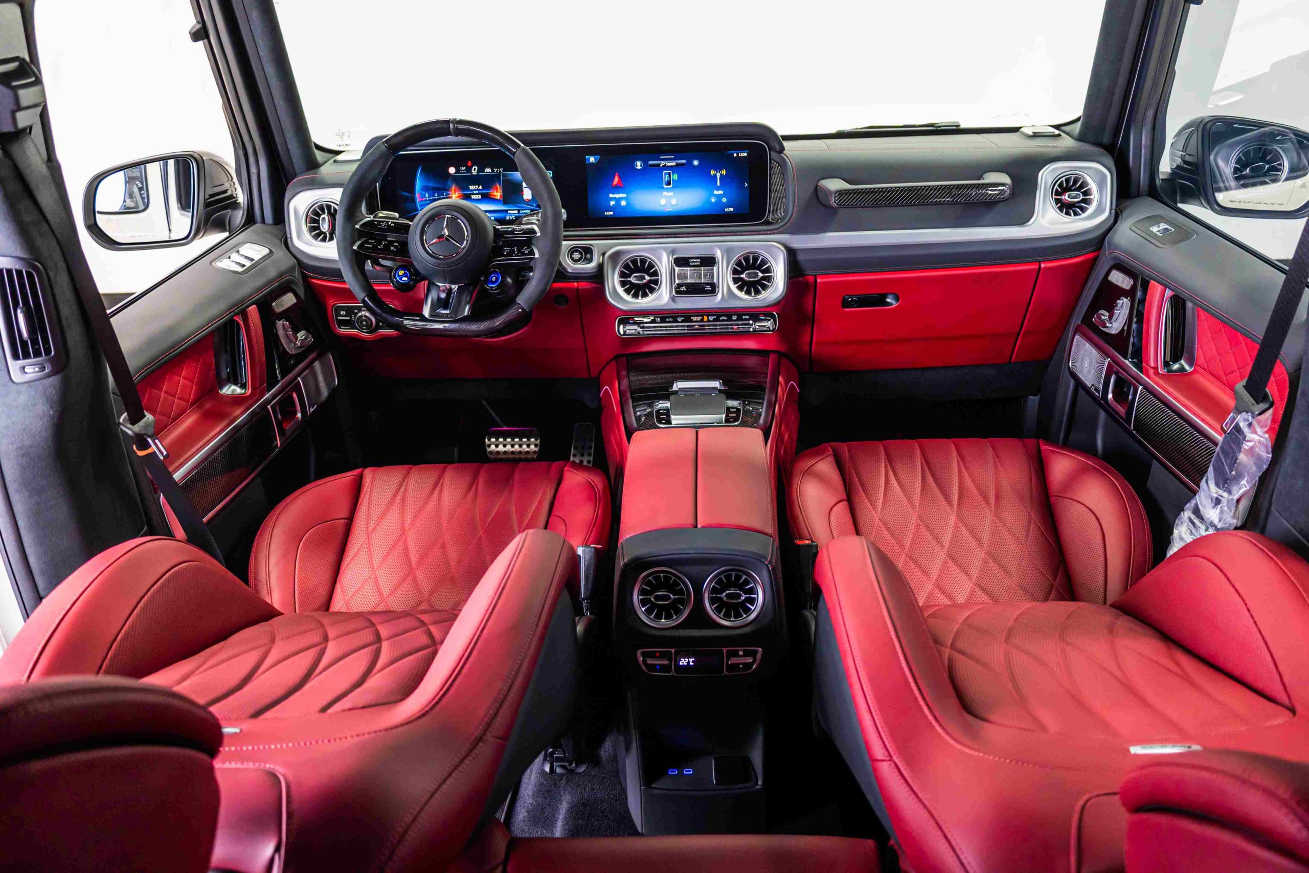 The dual 12.3-inch widescreen displays serve as the command center for the G63 AMG, allowing intuitive access to navigation, media, and vehicle settings. The Burmester sound system delivers an exceptional audio experience, while ambient lighting and customizable interior colors enhance the modern feel of the cabin. Passengers will appreciate features like Bluetooth connectivity, smartphone integration, and multiple USB ports, ensuring seamless entertainment and convenience for all on board.