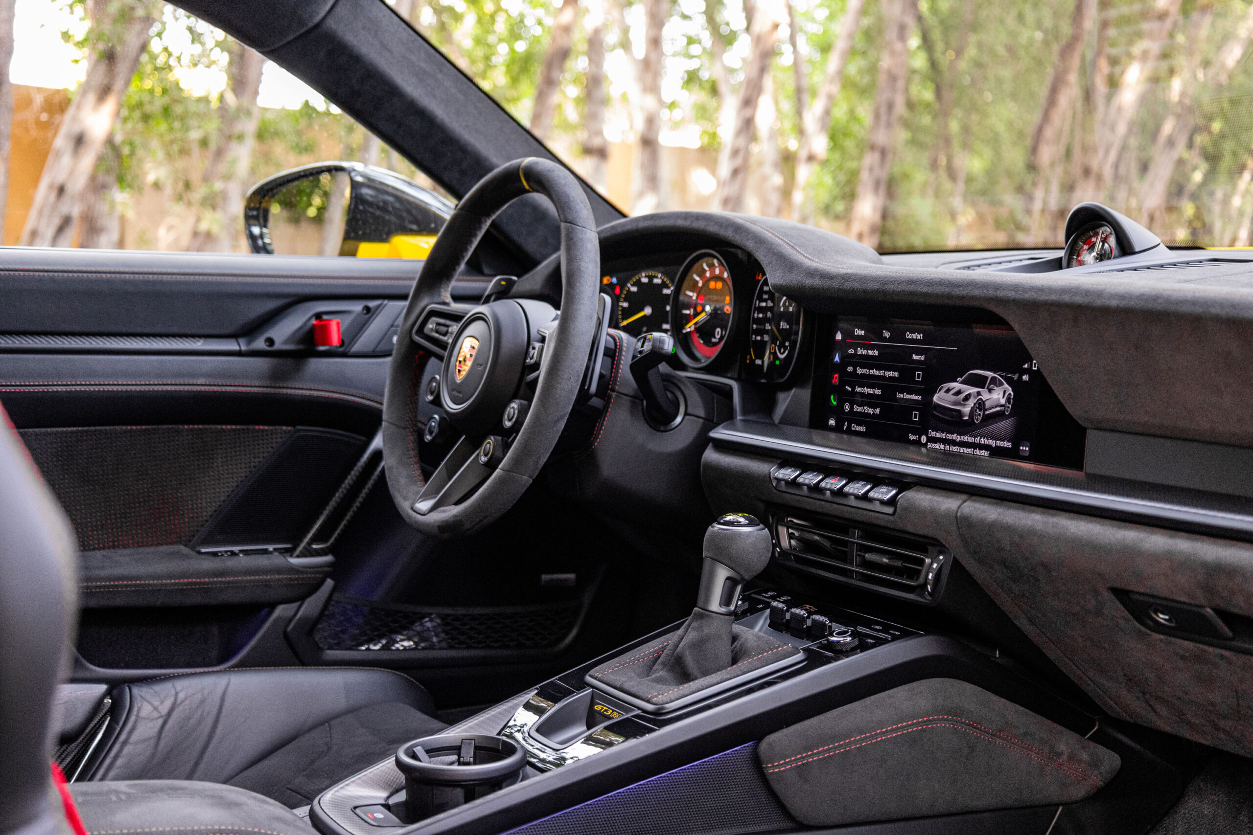 Step inside the Porsche Rental and you’ll discover a cockpit designed for pure driving precision. The interior is minimalistic yet high-tech, focusing on what matters most: the connection between the driver and the road. Carbon-fiber bucket seats provide necessary support and comfort during high-performance driving, while the Alcantara-wrapped steering wheel ensures precise control. The dashboard features a digital instrument cluster that delivers essential real-time performance data. The lightweight door panels, complete with storage nets and pull loops, are a nod to its racing pedigree. You can also find a 10.9-inch Porsche Communication Management (PCM) system, offering seamless control over your entertainment and navigation. This blend of precision engineering and cutting-edge features makes the Porsche GT3 RS an ideal choice for anyone looking to rent a sports car in Dubai.